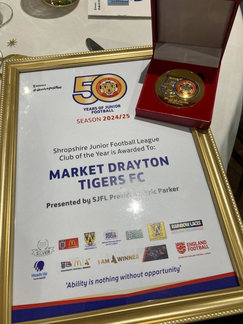 Shropshire Junior Football League awarded us Club of the Year at their 50th year anniversary in our 50th year!! This just goes to show how much hard work and dedication everyone puts in to our club and it's amazing for that to be recognised by the league 🐯⚽️ 💚 🤍